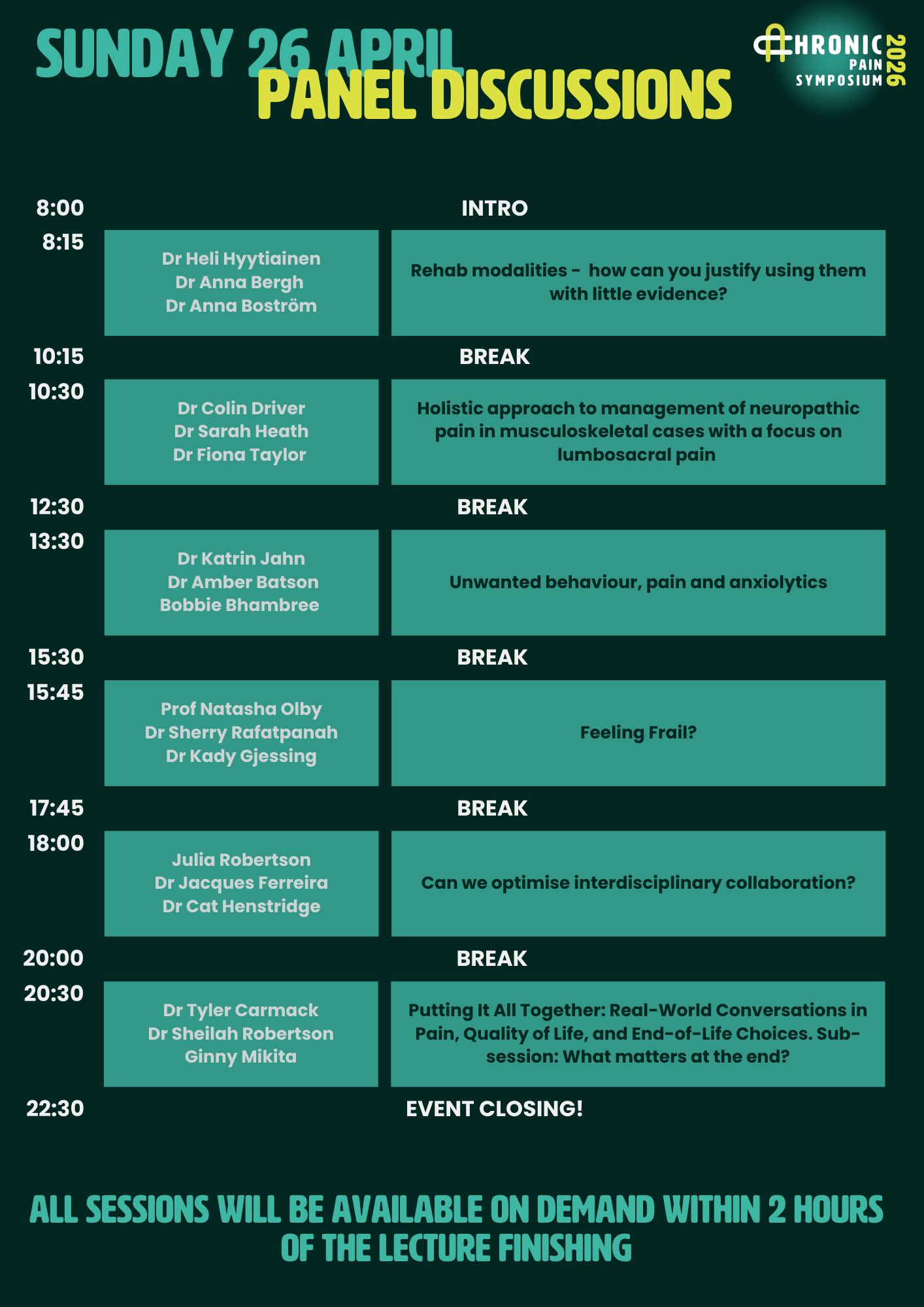 The Chronic Pain Symposium 2026 will be a 3 day event instead of a 4 day event. This is so that people can attend the live event without the need to take time off work. It also makes for a slightly less intense schedule, which hopefully means a more engaging learning experience.