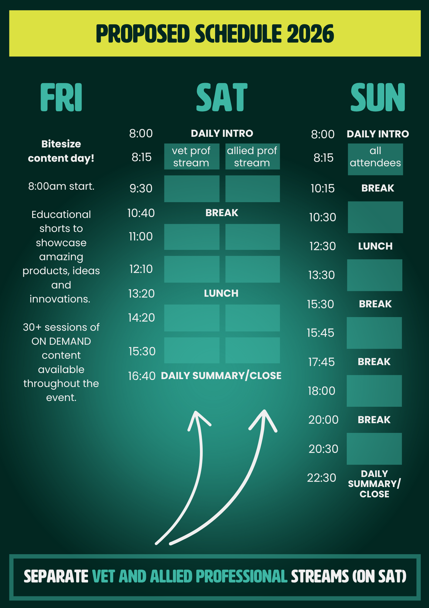 With two very clear audiences (vet professionals and allied professionals) we want to be able to offer more relevant content. Vet professionals will have a full day of live lectures from world leading experts, with a more medical and practice based focus.